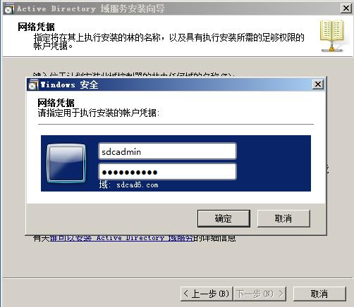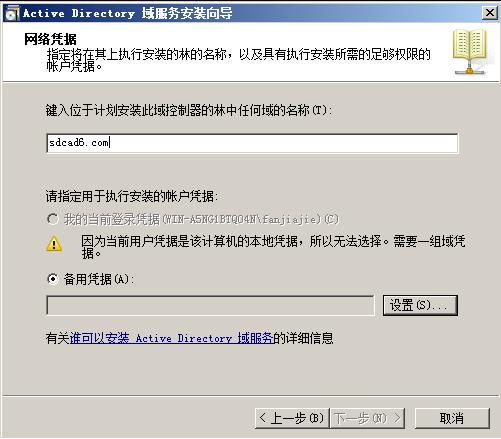 网络凭据 → 输入主域控的 DNS 名称 → 备用凭据 → 设置(登录帐号与密码) → 下一步