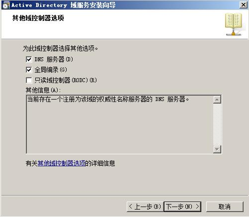 其他域控制器选项 → 勾选DNS服务器 → 下一步