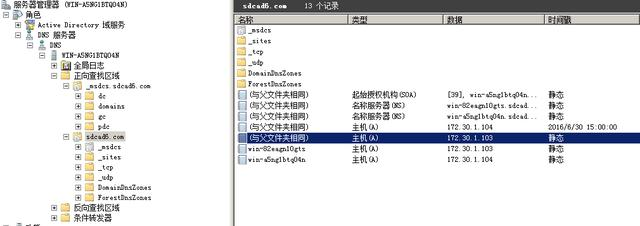 主域控服务器上同样也能看见额外域控(172.30.1.104)的DNS配置信息
