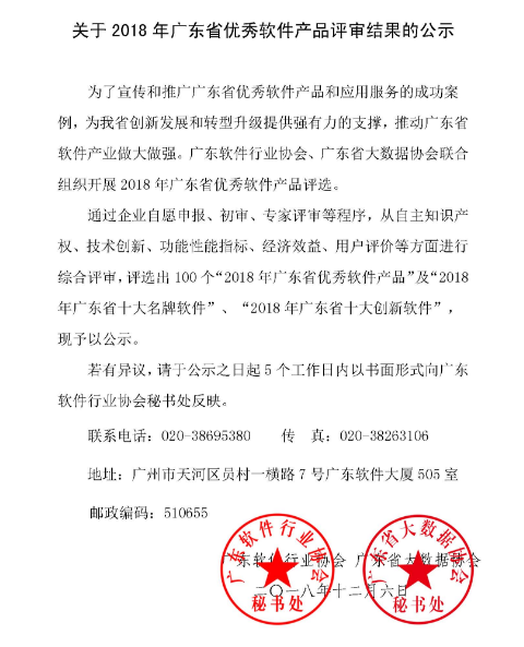 通过网上填报、初审、专家评审等严格程序,从自主知识产权、技术创新、功能性能指标、经济效益、用户评价等方面进行综合评审,共评选出100个“2018年广东省优秀软件产品”。广东互动的这两个软件产品的成功入选,充分证明了市场和用户对产品的认可。未来,广东互动将结合用户实际需求不断完善产品,进一步提高企业创新能力和核心竞争力,为更多的用户创造更大的价值。