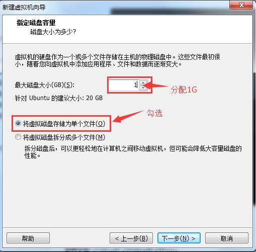 分配磁盘容量 1G ,勾选:将虚拟磁盘存储为单个文件(O),点击下一步
