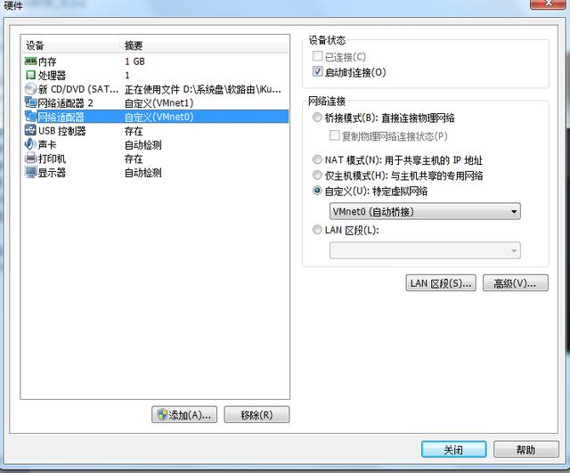再设置一下:网络适配器 自定义:特定虚拟网络 选择VMnet0(自动桥接) 点击关闭