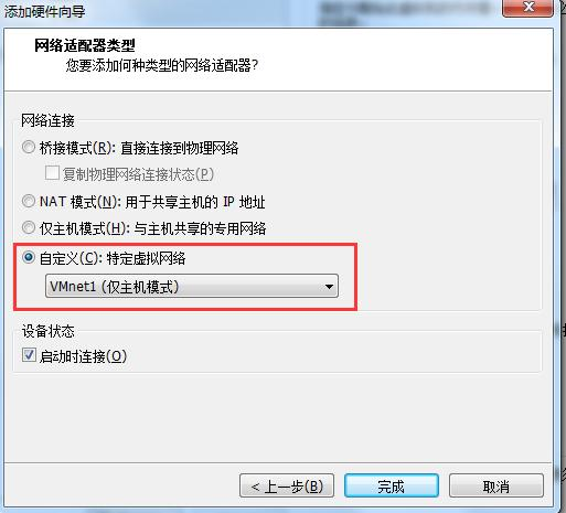 自定义:特定虚拟网络 选择VMnet1(仅主机模式) 点击完成