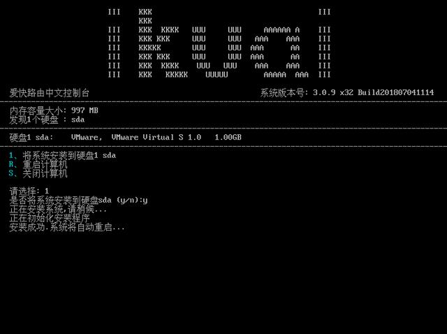 第三步:安装爱快ikuai固件,请选择:1 是否安装系统选择 y 然后按 回车。