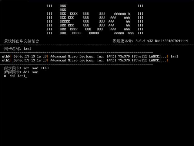 请输入菜单编号:1 然后回车,出现如下图:再输入命令:del lan1 回车解绑网卡。