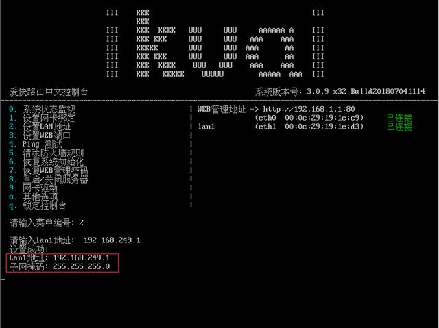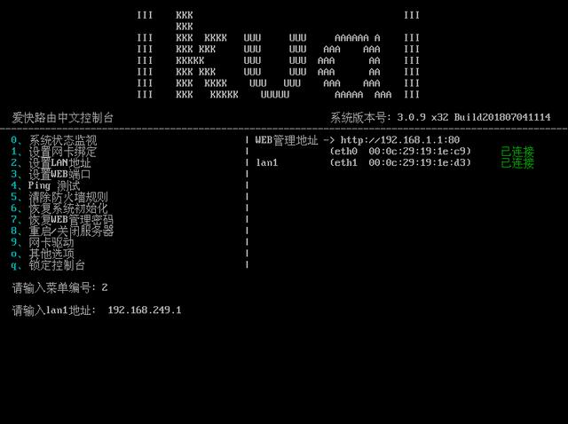 请输入菜单编号:2 按下回车,出现:请输入lan1地址:192.168.249.1 回车设置完成\