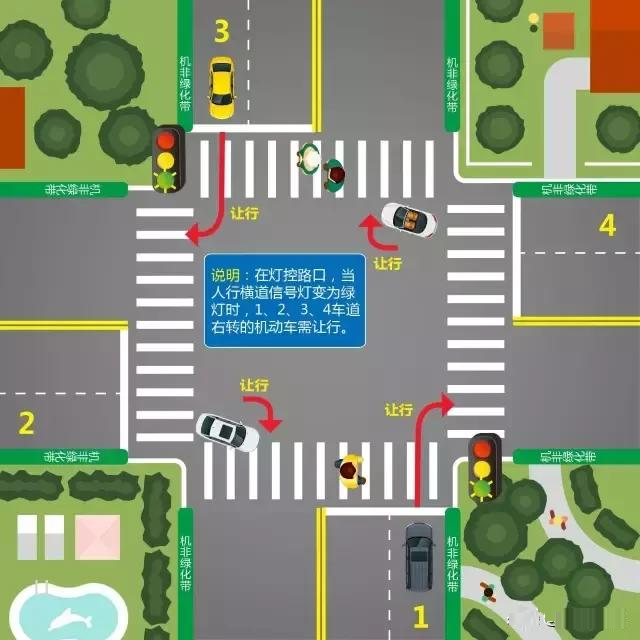 图为路口右转让行。当人行横道信号灯变为绿灯时,1、2、3、4车道右转的机动车都需让行。