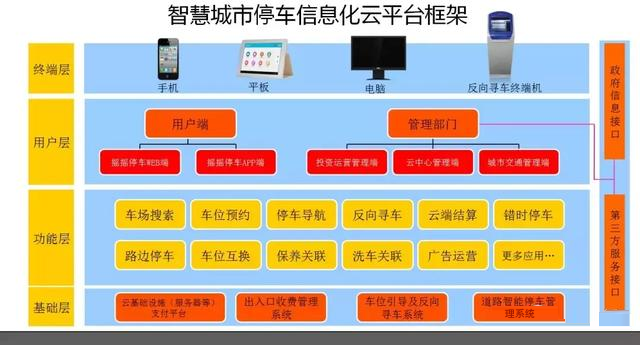 4、云停车服务平台(扩展功能):车主终端安装APP,平台为其提供停车位的查询、缴费、引导等功能。