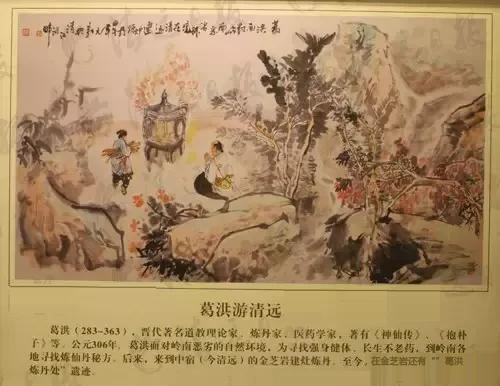 葛洪(283-363),字稚川,自号抱朴子,丹阳郡(今江苏)人,为晋代著名道教理论家、著名炼丹家、医药学家。他曾受封为关内侯,除了传播道教思想外,葛洪的兴趣主要在炼丹和医药这两方面。他著有《神仙传》、《抱朴子》、《肘后备急方》、《西京杂记》等。公元306年,葛洪面对岭南恶劣的自然环境,为寻找强身健体甚至是长生不老的药,来岭南各地寻找炼仙丹秘方。后来,他便辞别妻子和岳父,来到中宿(今清远)的金芝岩建灶炼丹。至今,在清远金芝岩还有“葛洪炼丹处”的遗迹。