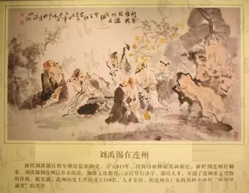 唐代刘禹锡官曾至朝廷的监察御史,公元815年,因做诗被怀疑讥讽朝廷,被贬到广东连州任刺史。刘禹锡到连州后并不沉沦,加强文化教育,亲自登台讲学,栽培人才,开创了连州重文兴教的传统。据史载,连州历史上共出进士138名,人才辈出,使连州在广东科举场上赢得“科第甲通省”的美誉。