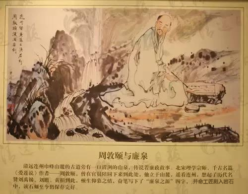 清远连州巾峰山麓的古道旁有一口清洌的山泉,传说着廉政故事。北宋理学宗师、千古名篇《爱莲说》作者——周敦颐,曾在官员陪同下来到此处,掬而饮之,一身暑气尽消。他立于山麓,遥看连州,想起了连州的历代名贤刘禹锡、刘瞻、黄损、石文德……激发了周敦颐心底的仰慕之情,并命人侍候笔墨,在泉水之侧的石崖上奋笔写下了“廉泉之源”四个大字,并命工匠凿入岩石中。四个大字每字一米见方,字迹笔笔工整,既昭古人又示来者,该石刻仍至今保存完好。据载,周敦颐平生不慕钱财,爱谈名理,以莲比喻道德高尚的人,平生不慕钱财,给人许多启迪。