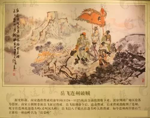 据史料,南宋逃将曹成靖康年间(1126—1127)从抗金前线溃败下来,流窜到湖广地区沦落为盗匪,随后被招安,但又反复成为贼寇。南宋王朝便委派岳飞征讨曹成。岳飞接到命令后,立即率部赶来讨伐。绍兴二年(1132)四月初,岳飞追击曹成来到了广西贺州。曹成等部据寨抵抗被击溃后,逃跑到了连州,死守在连州北部的蓬头岭(又叫凤头岭)。曹成在连州北部控制了狭隘通道,岳飞以八千精兵,在连州蓬头岭大胜曹成泱泱十万之众,成为一场以寡胜多的闻名战役。如今连州市西岸镇石兰古寨有一座山岭,山势雄伟,岭顶平坦,旧有石城,传为岳家军故垒,这座山岭为石兰古寨带来了千百年来的荣耀,故此以岳飞的姓氏命名为“岳荣岭”。