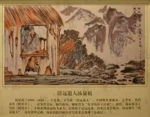 汤显祖(1550—1616),中国明代戏曲家、文学家。字义仍,号海若、若士、清远道人,江西临川人。他不仅于古文诗词颇精,而且能通天文地理、医药卜筮诸书。34岁中进士,在南京先后任太常寺博士、詹事府主簿和礼部祠祭司主事。他的代表作《牡丹亭》,一直享誉文坛、驰名海外,他被誉为“东方的莎士比亚”。相传,汤显祖为了写作《牡丹亭》专程来到飞来寺做了一名挂名道士,别号“清远道人”。他钟情于清远山水,经常泛舟峡山,对飞来峡上的缥幡岭大为赞赏:“极目缥幡外,飞峰并欲翻。日光榕树岭,青色大莲村。”后来,汤显祖慕名来到金鸡岩,凭吊葛洪炼丹遗址和著名隐士卢度的住处,被天然石床所吸引,于是在岩内寄宿,坐在石床上构思名垂千古的名剧《牡丹亭》。还有的资料记载“明代戏剧大师汤显祖隐居清远峡山并写出著名戏剧《还魂记》”……总之,汤显祖与清远有不解之缘。