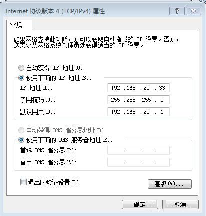 ip是192.168.20.33,子网掩码是255.255.255.0,网关是192.168.20.1