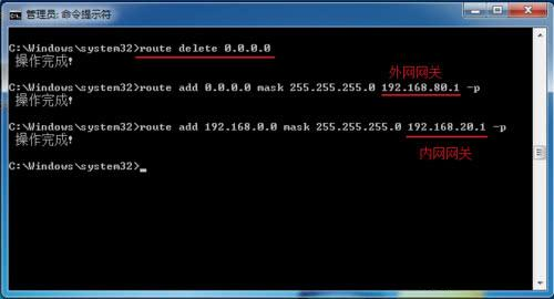 2、输入route add 0.0.0.0 mask 255.255.255.0 192.168.80.1 -p,回车;(192.168.80.1为外网网关)