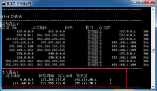 在CMD窗口中,输入route print,查看是否成功配置,如果成功会显示下图红框信息(ip,网关等产生因实际情况而异)