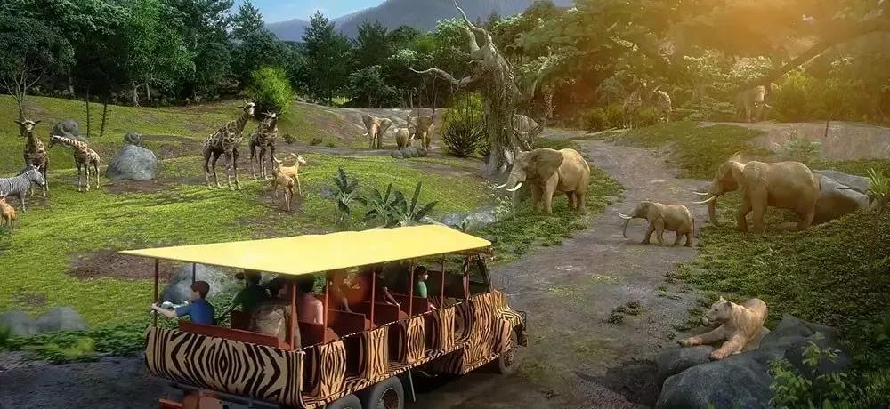 四大主题酒店就位于森林乐园入口广场两边,观景方面将与森林乐园实现“资源共享”,每位住客还能在酒店的房间阳台上,观赏到如非洲草原般的真实动物生态。