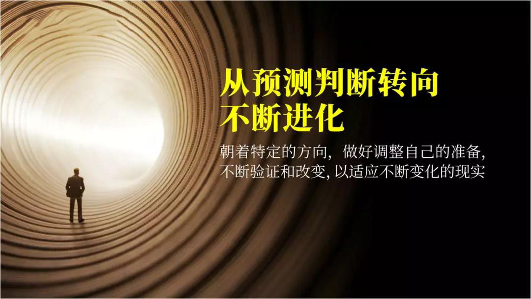 今天我们可能要训练自己一个能力,这个能力就叫做从预测判断转向不断进化。任正非说过一句话让我深受影响,他说在今天来讲,方向大致正确,关键在于执行和效率。这恰恰可以告诉我们,带领一家公司成为全球最强企业的领袖,他对于未来的选择是什么。很多人已经习惯通过预测、判断,然后再去做选择,但是今天最重要的不是做预测,而是你能不断地进化。