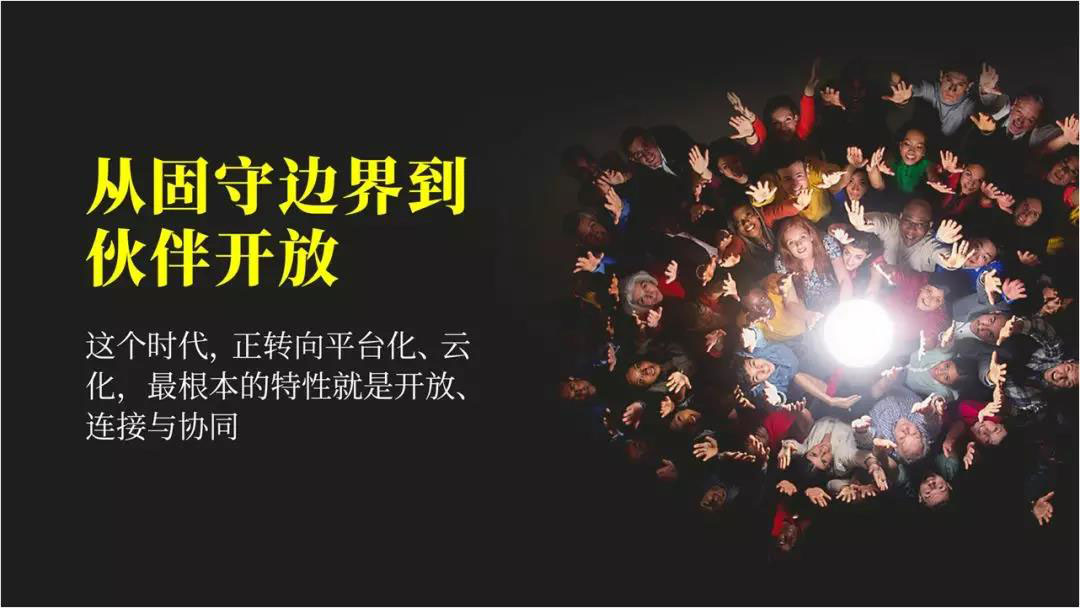 平台化和云化最大的特征是什么?就是开放、连接与协同。我们做任何事情,尤其是做企业的人,要懂的一件事情就是企业的边界。在边界里边,组合各种要素的效率和成本比别人快,企业就有竞争力。但是今天互联网最大的变化是,组合要素的效率和成本在企业外部更快,互联网打破了边界。当你能够伙伴开放的时候,其实你就可以真正做连接和协同。