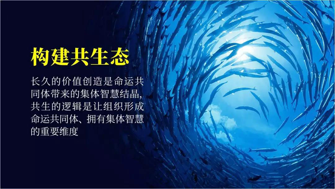 当能够形成命运共同体的时候,其实我们就拥有了无限的去解决问题的可能性。当能够拥有无限解决问题的可能性的时候,我们其实就有了一个共生的概念。长久的价值创造是命运共同体带来的集体智慧结晶,共生的逻辑是让组织形成命运共同体、拥有集体智慧的重要维度。