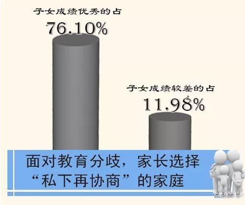 面对教育分歧,父母选择“私下再协商”的家庭,其子女成绩优秀的比例高达76.10%,而成绩较差的学生家庭选择比例仅为11.98%。
