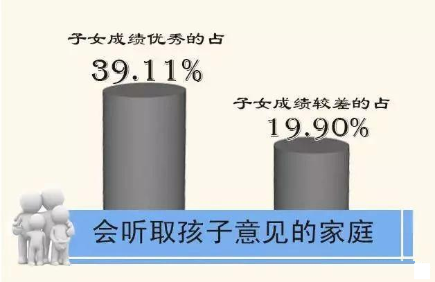 数据显示,“会听取孩子意见”的家庭,子女成绩优秀的占39.11%,而子女成绩较差的比例仅为19.90%。