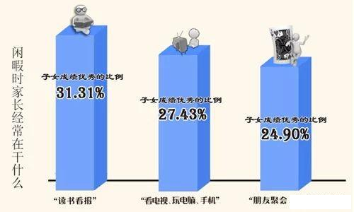 数据显示,“阅读型”家庭子女成绩优秀的比例更高。闲暇时父母经常“读书看报”的家庭中,其子女成绩优秀的比例为31.31%,高于“看电视、玩电脑、手机”(27.43%)、“朋友聚会、打牌娱乐”(24.90%)等家庭。