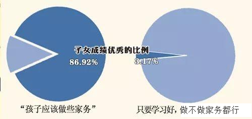 通过数据可知,自理能力强的小学生学习能力也强。并非把所有的时间都留给孩子学习和休息才是明智的选择。那些认为“只要学习好,做不做家务都行”的家庭中,子女成绩优秀的比例为3.17%,而持有“孩子应该做些家务”观点的家庭中,此比例为86.92%,两者相差悬殊。
