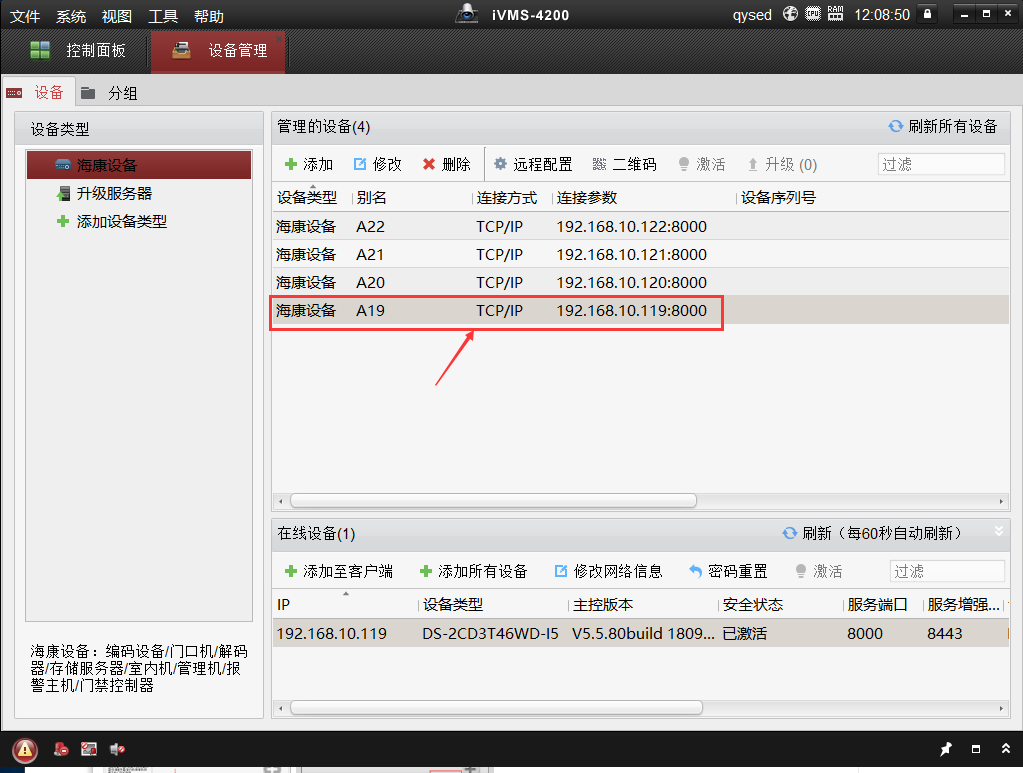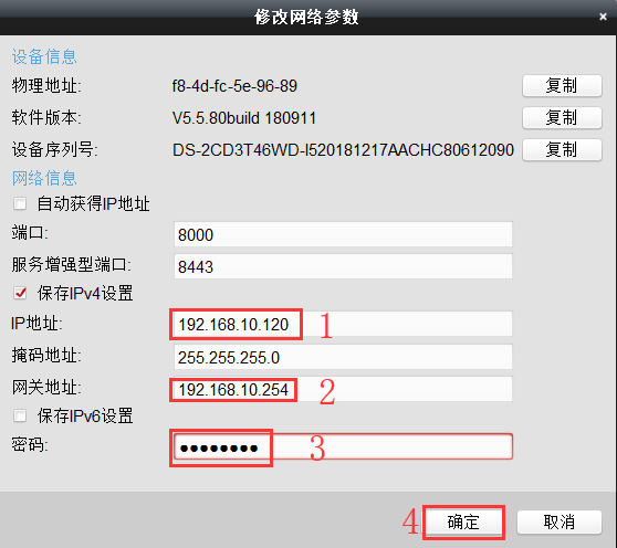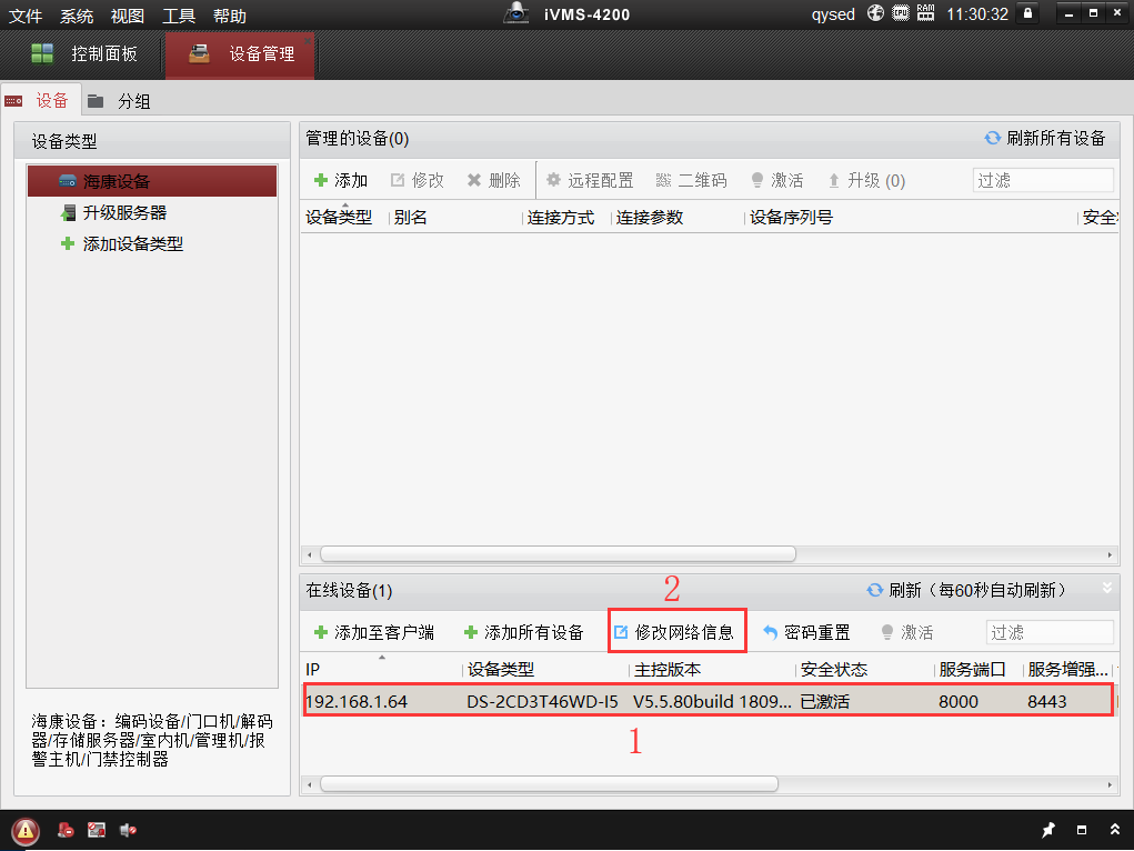 三、选择已激活的在线设备,点激“修改网络信息”,输入网络参数和激活时所留密码。