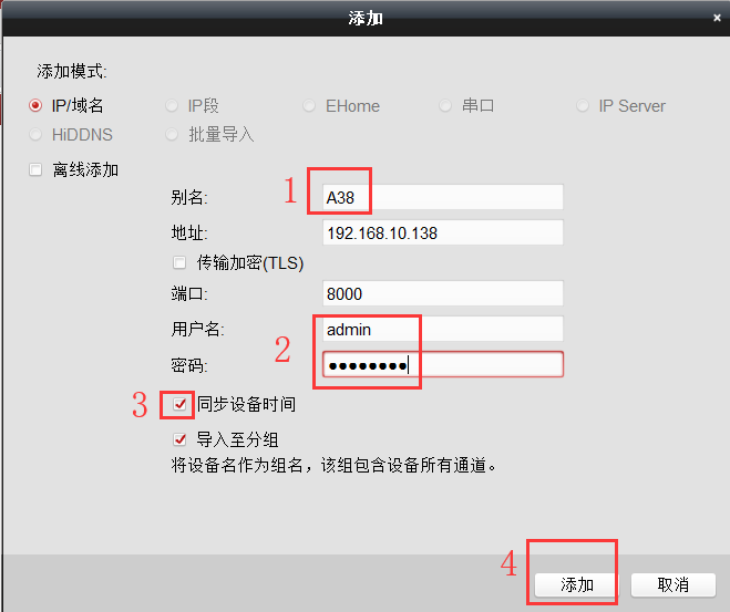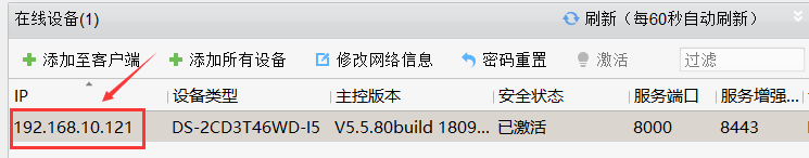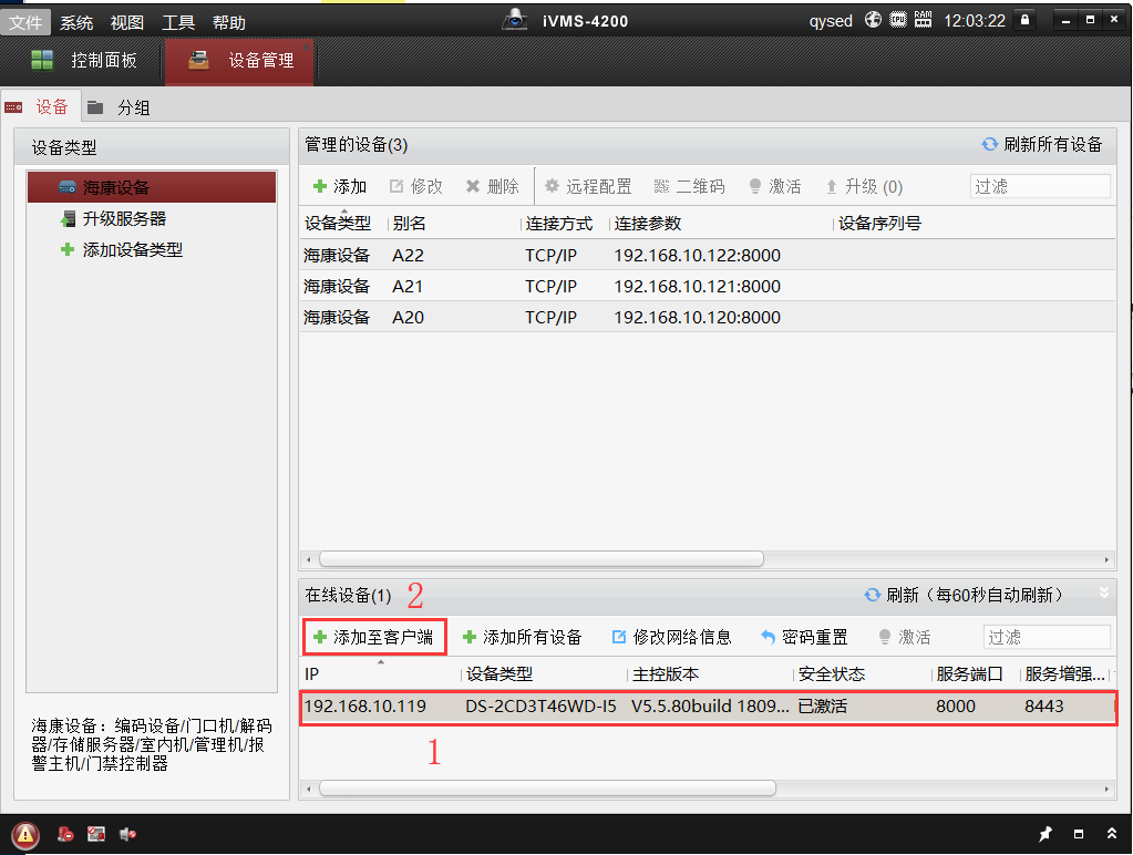 四、选择在线设备点激“添加至客户端”,输入相关参数和帐户密码。