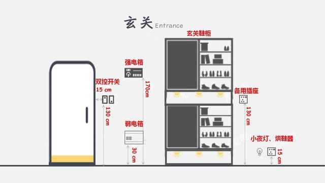 预留2-3个插座,插座高度如图,可以布置在鞋柜底部和中间。用于烘鞋器、氛围灯等。