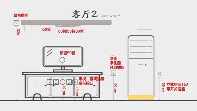 客厅正面一般预留4-8个插座,电视机下可预留两个四孔插座。
