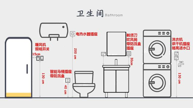 卫生间插座一般预留4-6个,如果洗衣机烘干机在阳台就把插座挪到阳台,同时插座高于进水口。