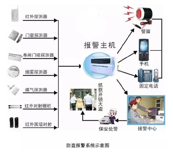 1) 防盗报警系统分别由探测器、区域控制器和报警控制中心三部分构成。其原理如以下系统图: