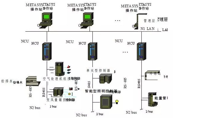 METASYS操作站METASYS操作站METASYS操作站管理层N1 LANNCUNCUNCU给排水RS-485RS-485RS-485…变风量箱控制器N2 busN2 busN2 bus单元型控制器智能型照明控制器……冷冻站能量管理空气处理机组控制器。
