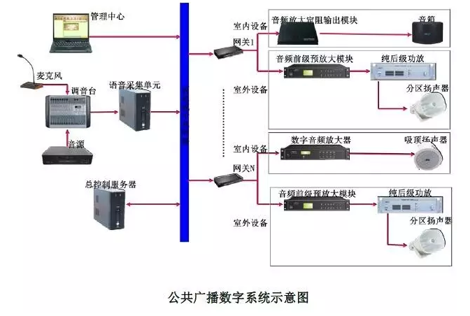 公共广播系统简称PA系统(Public Address)广泛用于车站、机场、宾馆、商厦、医院和各类大厦提供背景音乐和广播节目,近几年来公共广播系统又兼作紧急广播。它的主要用途是业务宣传和时事政策广播、播送背景音乐和广播公共寻呼、火灾事故和突发事故的紧急广播。 现今的公共广播集播放背景音乐,宣传、寻呼广播和火灾事故的紧急广播为一体。这是一种通用性很强的广播系统。随着我国经济的快速发展,特别是公共基础设施的大量兴建,我国公共广播呈现了快速发展的势头,发展空间较大。