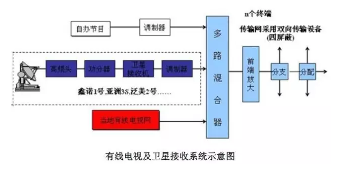 有线电视系统主要由信号源、前端、干线传输和用户分配网络组成。信号源接收设备向前端提供系统欲传输的各种信号。它一般包括开路电视接收信号、调频广播、地面卫星、微波以及有线电视台自办节目等信号。系统的前端部分的主要任务是将信号源送来的各种信号进行滤波、变频、放大、调制、混合等,使其适用于在干线传输系统中进行传输。系统的干线传输部分将系统前端部分所提供的电视信号通过传输媒体不失真地传输给分配系统。其传输方式主要有光纤、微波和同轴电缆三种。