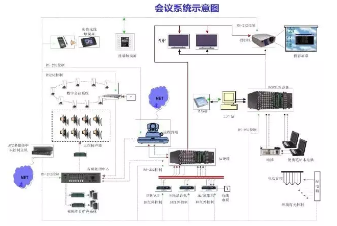 配置手拉手会议主席机、代表机发言系统。摄像机可以自动跟踪发言者,为每个代表席配置一台液晶显示器,使得每个代表都可以看到清晰的画面,在每个与会者的面前放置一个电子桌牌,考虑到与会人员可能来自不同的国家,同时配置同声传译系统;同时考虑多元化功能,配置高品质无线MIC,信号部分采用VGA、AV矩阵组合,能实现多元化的信号处理,开会时使用者通过开启集中控制系统,液晶显示系统与投影幕可以将发言者的讲稿或图像根据需要分别显示出来,同时控制多功能厅的灯光、窗帘、幕布等系统动作,为与会者提供一个方便、快捷、舒适的现代化手段的平台。
