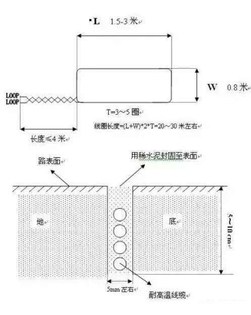 在理想状况下(不考虑一切环境因素的影响),电感线圈的埋设只考虑面积的大小(或周长)和匝数,可以不考虑导线的材质。但在实际工程中,必须考虑线导线的机械强度和高低温抗老化问题,在某些环境恶劣的地方还必须考虑耐酸碱腐蚀问题。由于导线一旦老化或抗拉伸强度不够导至导线破损,则检测器将不能正常工作。在实际的工程中,建议采用1.0mm以上铁氟龙高温软导线。