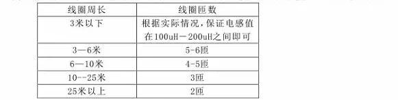 为了使检测器工作在最佳状态下,线圈的电感量应保持在100uH-300uH之间。在线圈电感不变的情况下,线圈的匝数与周长有着重要关系。周长越小,匝数就越多。一般可参照下表:
