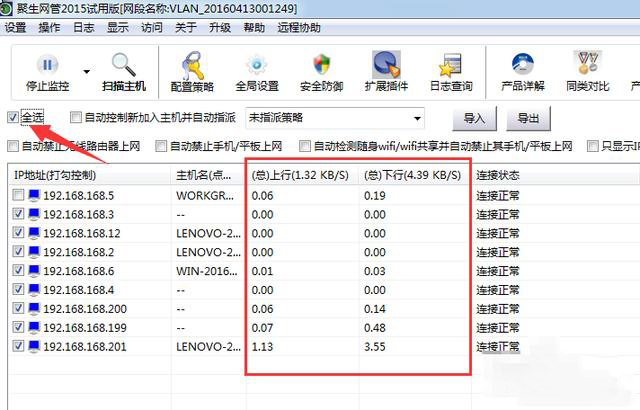 “聚生网管”一款老牌的局域网管理工具,以前我经常推荐给朋友使用,尤其是在群租房里大家共用宽带的时候,总是有些人全天24小时P2P下载占用带宽,我就用这款软件来解决这种问题。下载安装完成之后选择使用的网卡开始监控: