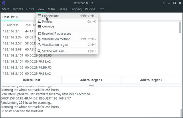 经过一番扫描之后,可以看到当前我的局域网上所有的主机了,再选择View→Connections查看当前这些主机的所有连接情况: