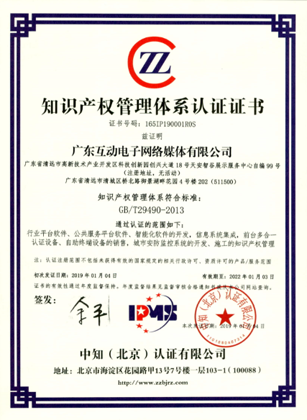 2019年1月4日,广东互动电子网络媒体有限公司顺利通过了《企业知识产权管理规范(GB/T-29490-2013)》国家体系认证,并获得由中知(北京)认证有限公司颁发《知识产权管理体系认证证书》,获得“知识产权管理体系认证证书”标志着对我司在知识产权管理的标准化、规范化方面极大认可,这将是我司发展史上的又一里程碑。