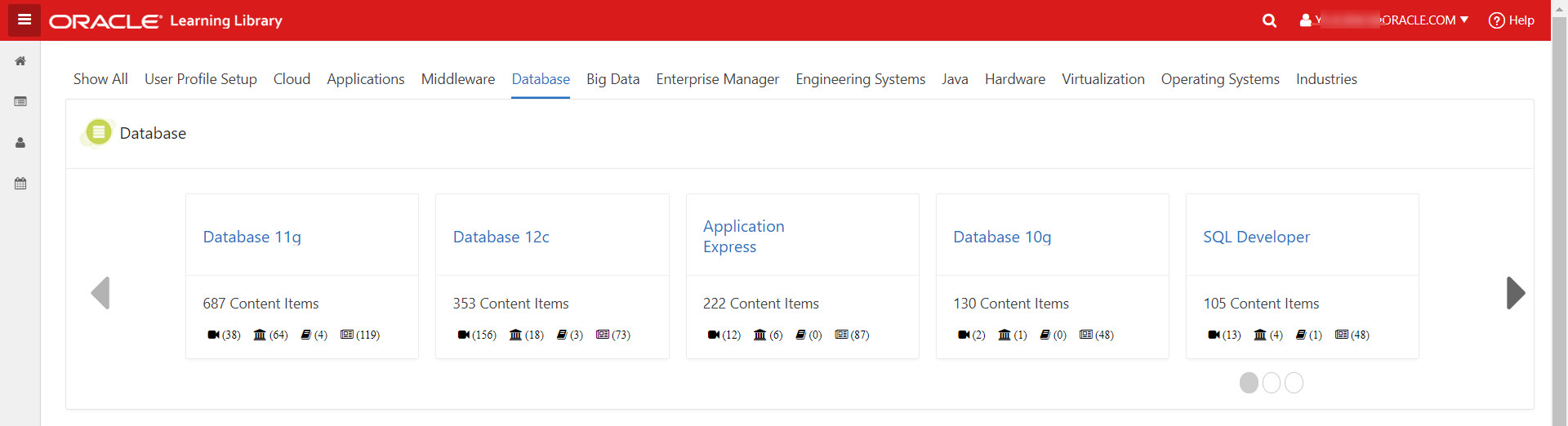 点击首页的Discover,可以进行分类搜索。例如在上方选择产品为Database,即可找到Oracle数据库11g,12c和18c的相关内容。在每一个搜索结果的下方,会显示相关资源的类型(视频,OBE,教程或培训)和数量。