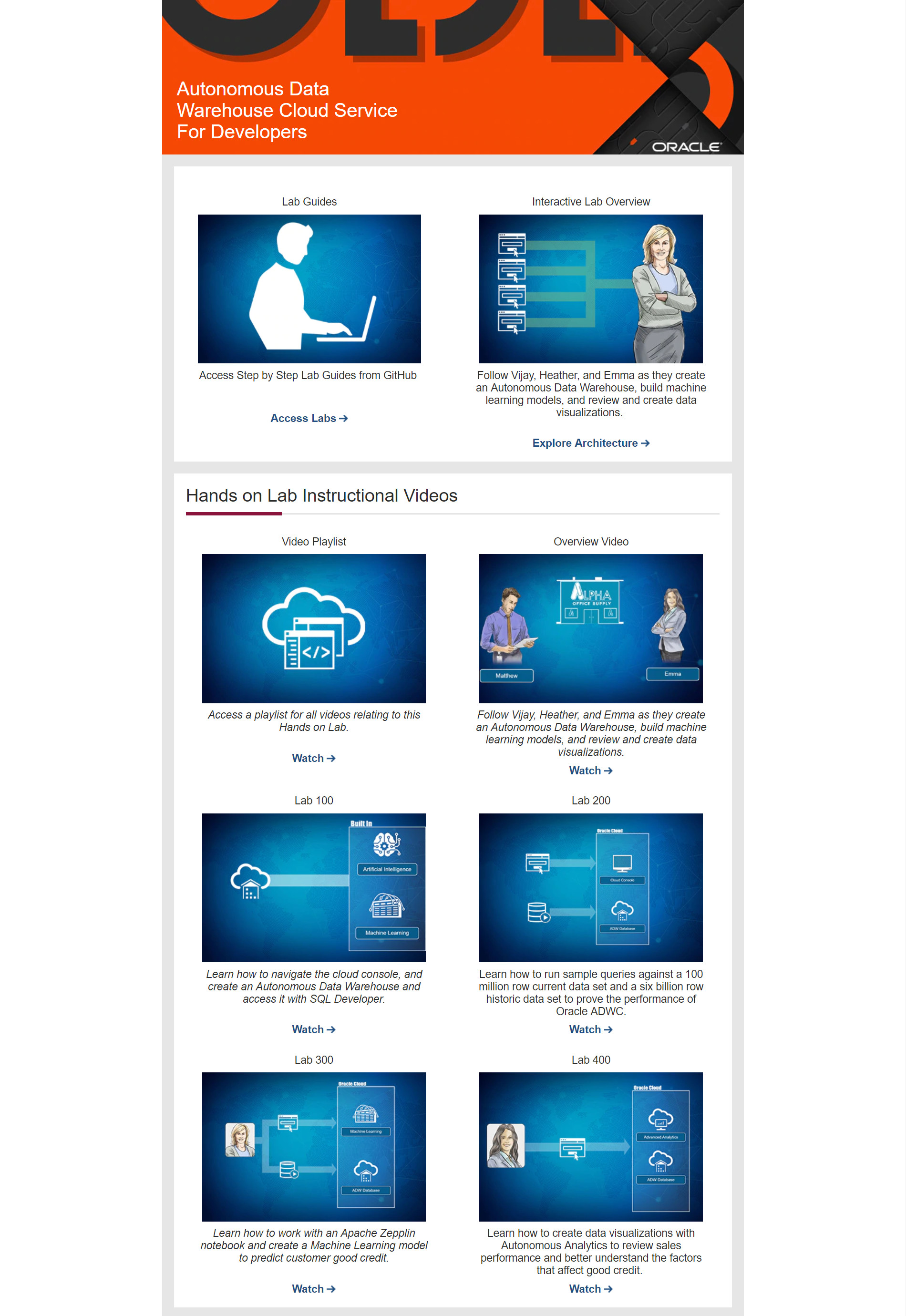 以下是自治数据仓库的课程页面,小编看了一下,设计挺精美,其中的虚拟人物颇有美漫风格,大家可以尝试一下。部分动手实验也可以在https://go.oracle.com/HOL下找到。