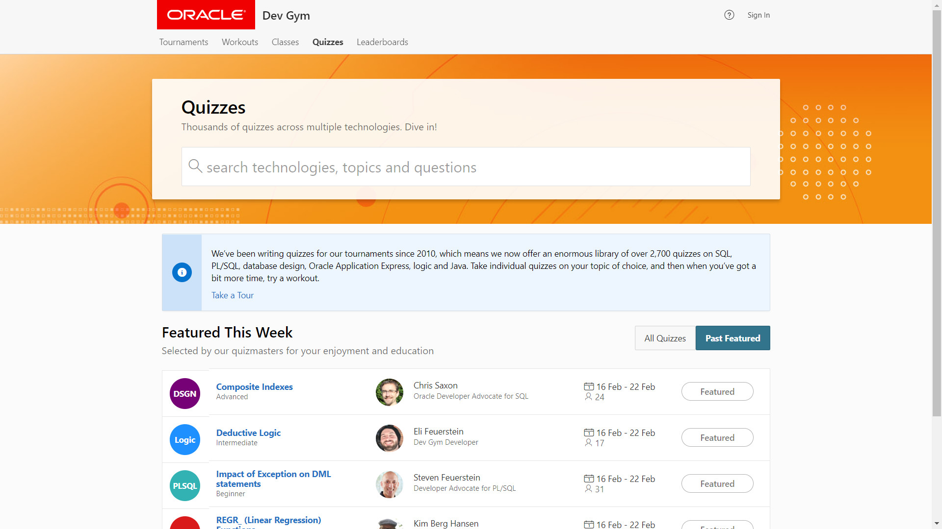 测验(Quizzes)- 从2010年开始,Dev Gym已经积累了2700多个测验(选择题),你可以选择感兴趣的主题来学习 SQL, PL/SQL, 数据库设计, Oracle Application Express, 逻辑和Java。