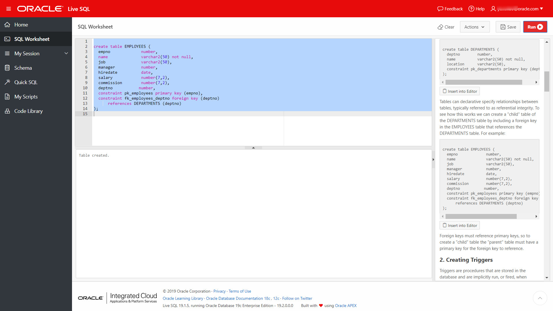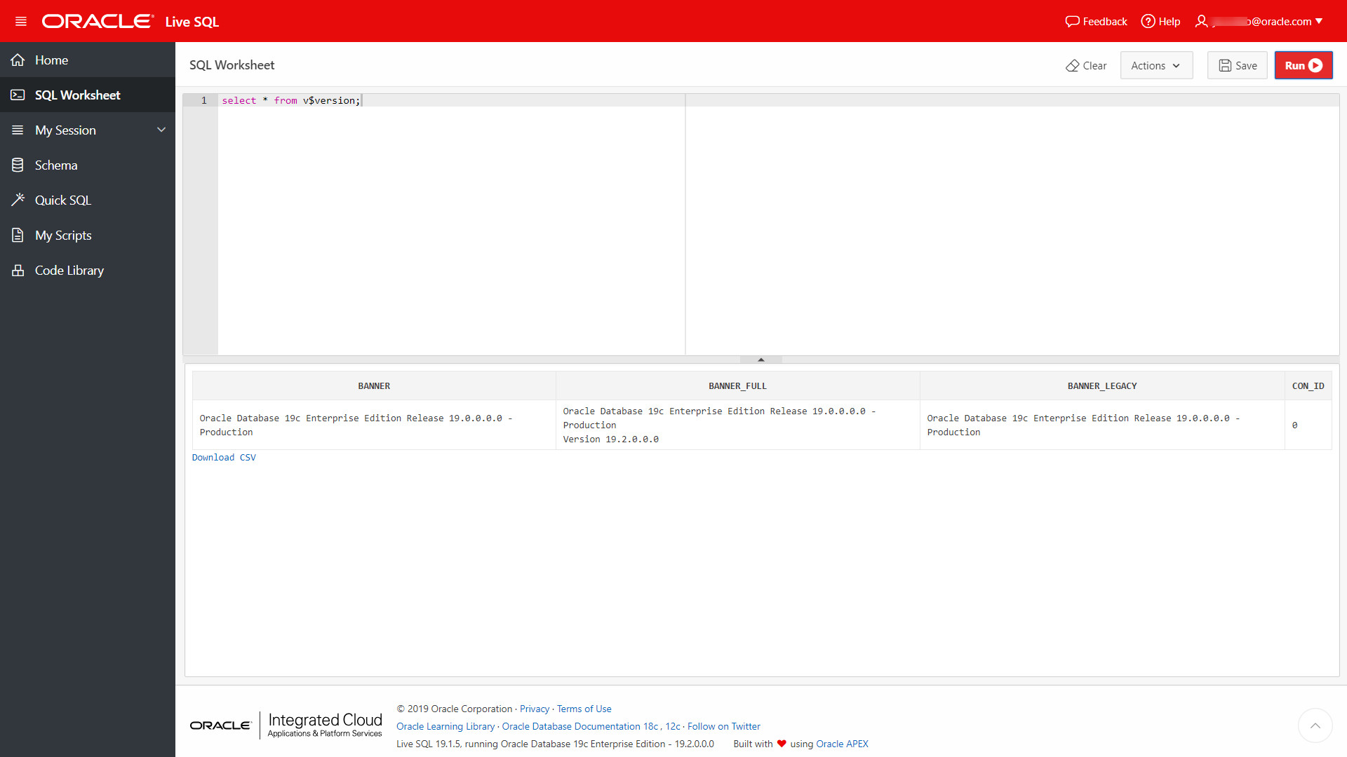 Live SQL非常适合于学习SQL和PL/SQL。正如其名字所示,Live SQL的第一个功能就是提供在线的SQL执行环境(SQL Worksheet)。值得一提的是,Oracle数据库19c版本最初就是在Live SQL上发布的,无需安装数据库,您就可以体验19c的新特性,来试一试吧。