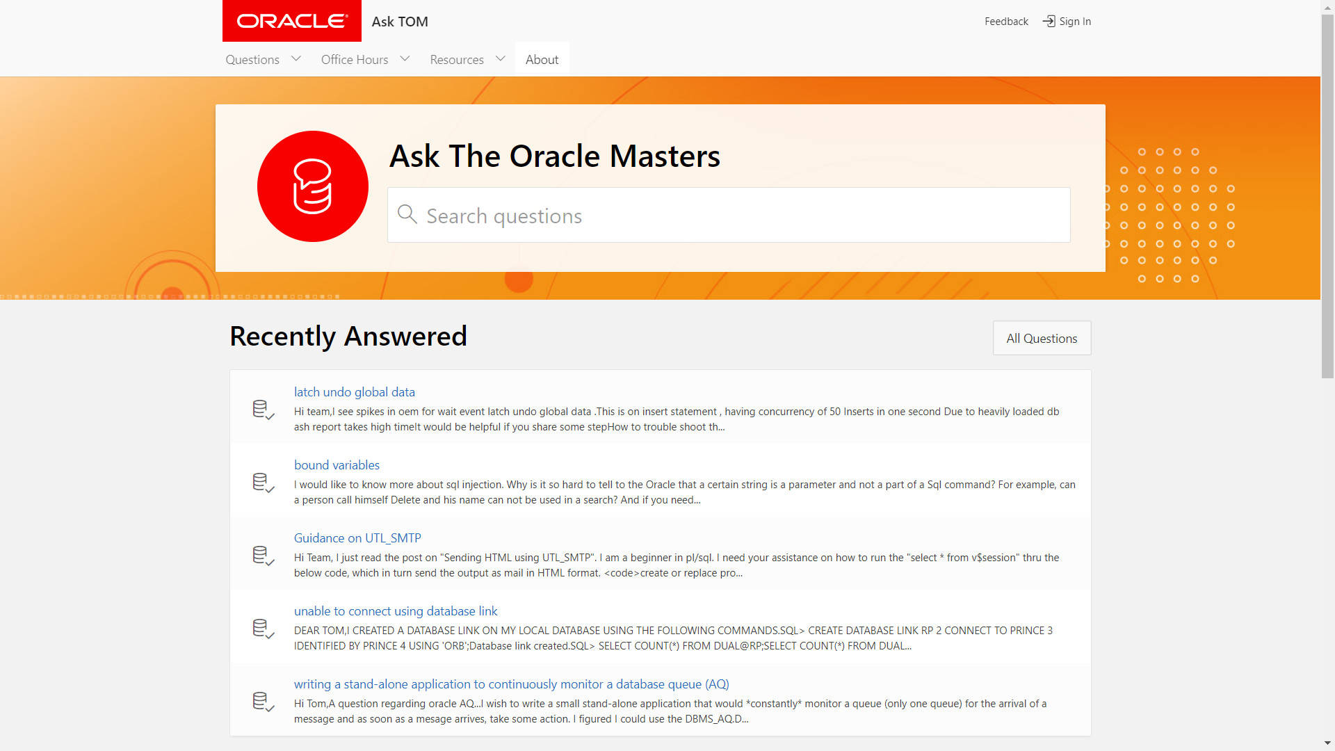 网站的名称来自于Oracle数据库大师Tom Kyte,之前的大多数问题都是由其解答的,如今他已经退休,目前由Chris Saxon,Connor McDonald和 Maria Colgan三位专家主持。