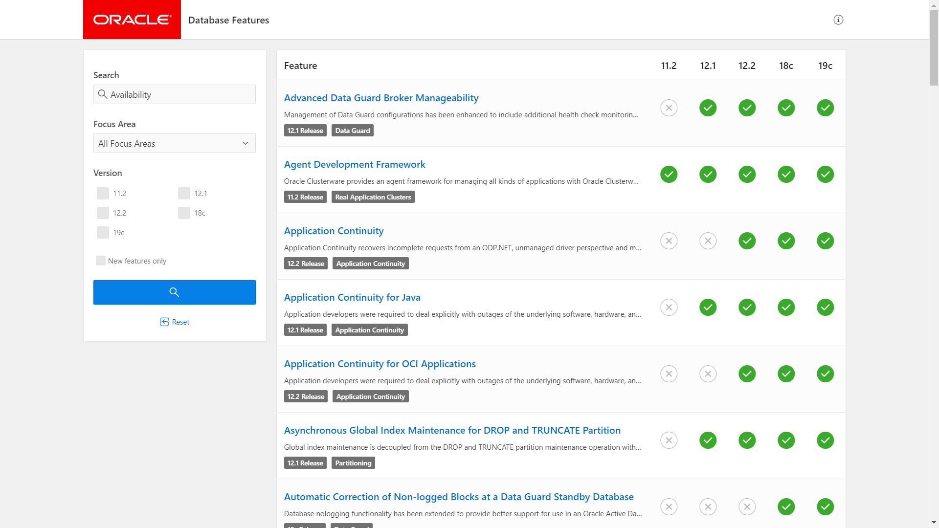 Oracle数据库的流行,很大一部分归功于其丰富的特性,此网站整理了1111项数据库特性。通过此网站,您可以了解某一数据库版本所拥有的数据库特性,或某一项数据库特性在哪些版本中支持。例如AL32UTF8作为数据库默认字符集是从版本12.2开始的,多租户架构是从版本12.1开始支持的,诸如此类。