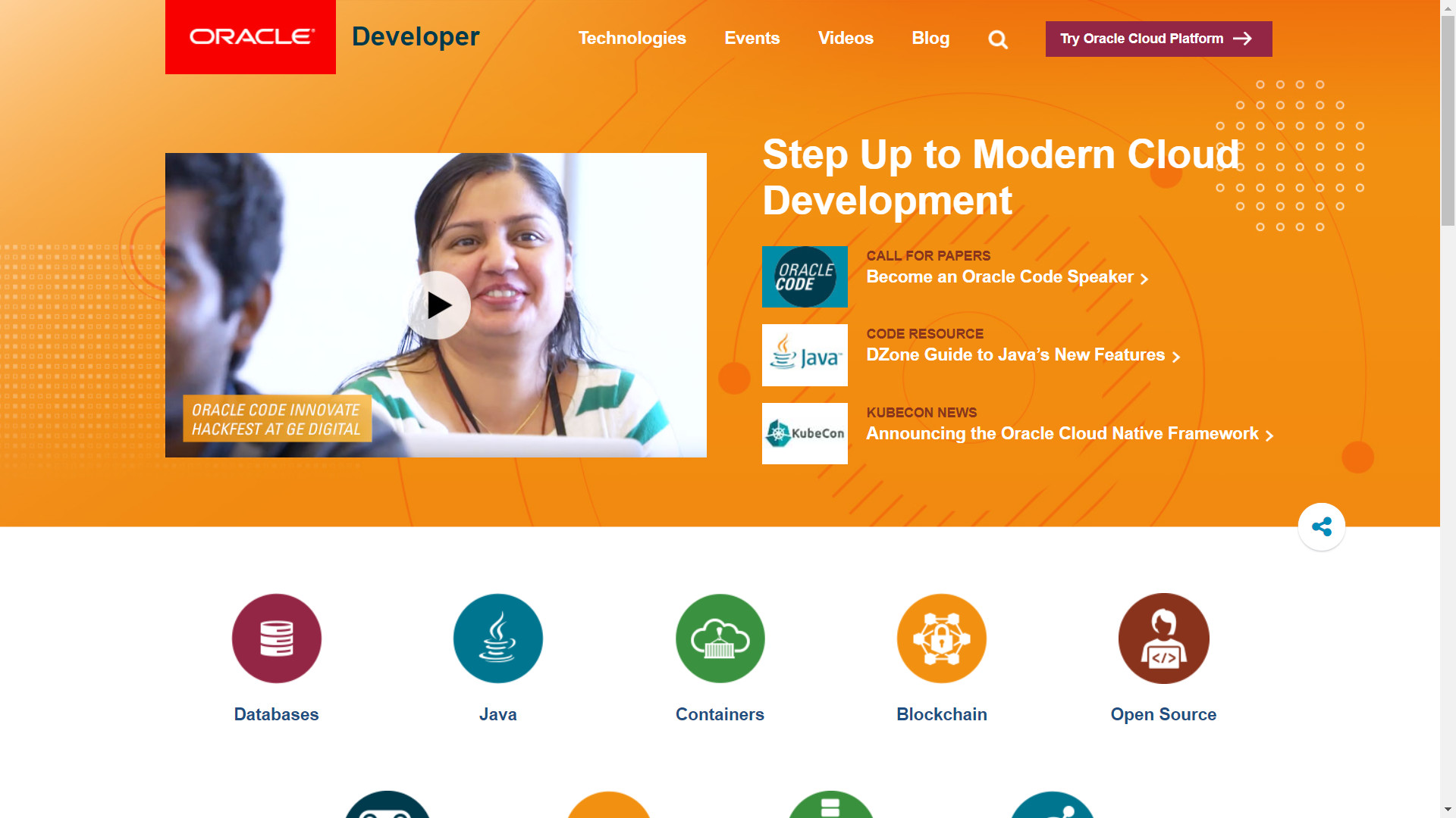 Oracle开发者门户包含了我们之前介绍的一些资源,如Oracle Learning Library,Oracle帮助中心和Oracle BLOGS等,此外还包括Oracle University(Oracle大学),Oracle Academy(Oracle学院),Oracle CodeOne等资源。在这里,你可以学习数据库,JAVA,容器,区块链及开源技术(MySQL,Oracle Linux,Kubernetes和VirtualBox等)。